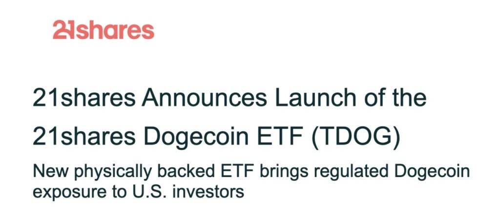 The product is issued by 21Shares and began trading on NASDAQ under the stock code TDOG after gaining approval from the SEC, making it the first spot Dogecoin ETF approved in the US.