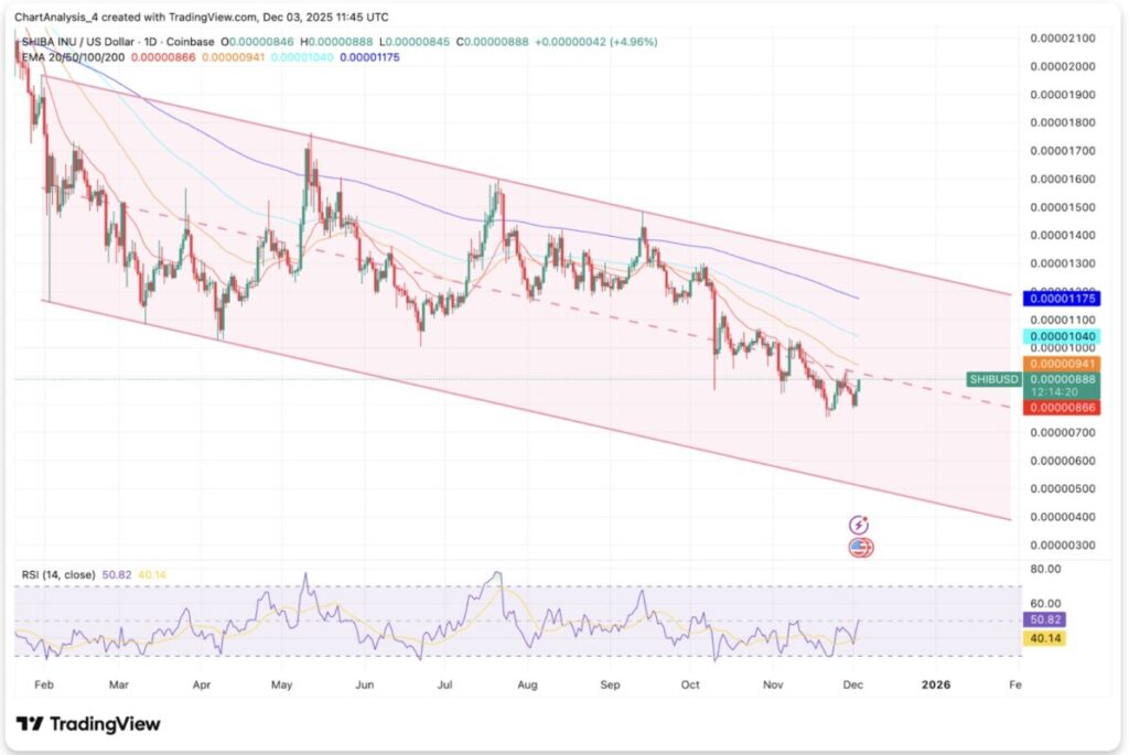 The daily chart shows that SHIB is still moving within the downtrend channel formed since the second quarter. Price remains below the upper boundary of the channel and is also still trading below the 20-, 50-, 100-, and 200-day Exponential Moving Average (EMA).