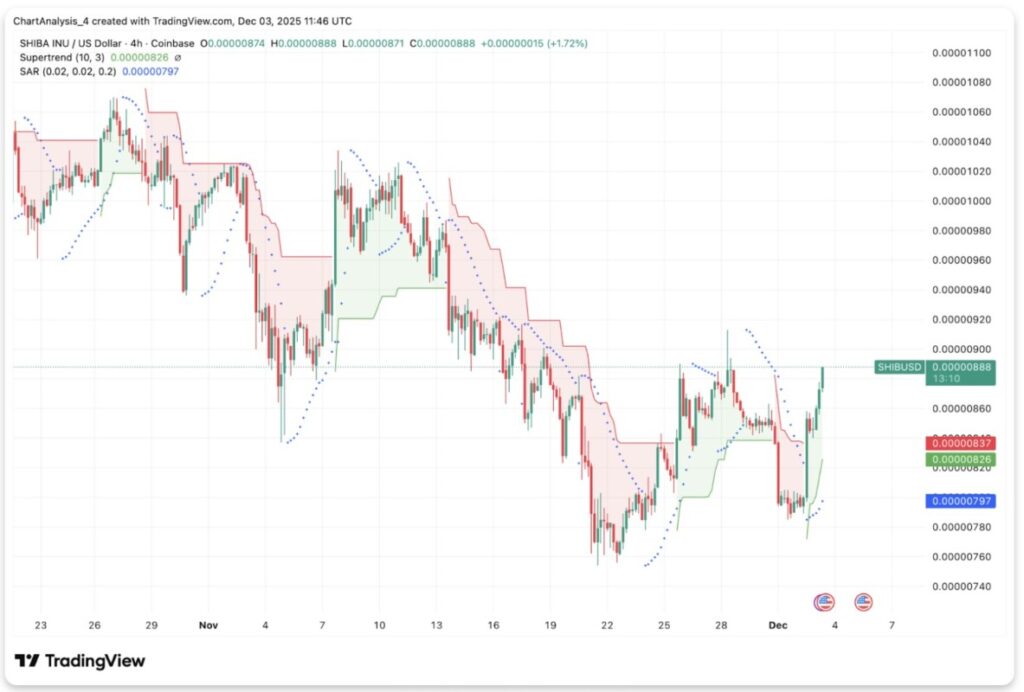 On the 4-hour chart, SHIB has broken the short-term Supertrend resistance around $0.00000826. The dots of the Parabolic SAR indicator are now below the price, which suggests a short-term momentum shift.