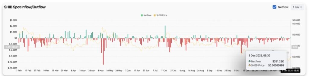 Shiba Inu showed a fairly clean short-term recovery, supported by technical signals from the Supertrend indicator and a Parabolic SAR reversal. However, this move is yet to be confirmed in terms of flows, and remains within the dominant downtrend structure.
