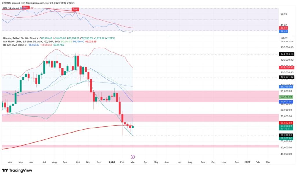 Pada pekan pertama Maret, Bitcoin (BTC) gagal mempertahankan posisinya di atas $70.000, menandakan lemahnya kekuatan beli. Grafik mingguan BTC/USDT di TradingView memperlihatkan pola channel menurun yang semakin jelas. Level $68.000 yang sebelumnya menjadi support penting kini berubah menjadi resistance kuat, membatasi setiap upaya pemulihan harga.