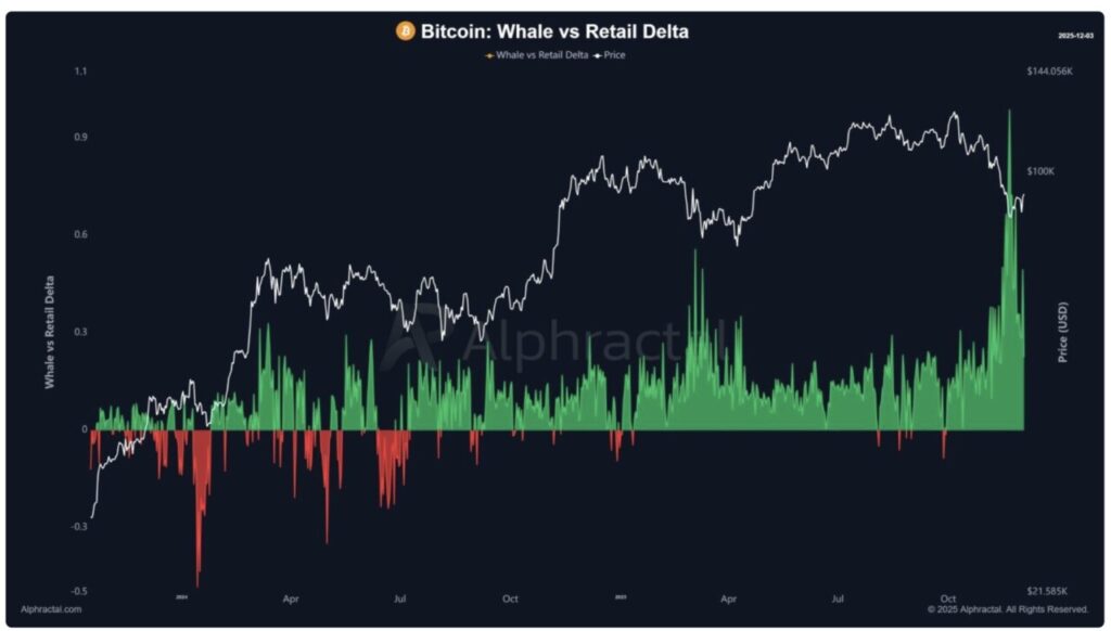 Sebuah grafik terbaru Whale vs. Retail Delta dari Alphatractal menunjukkan lonjakan akumulasi whale paling signifikan dalam hampir dua tahun terakhir.