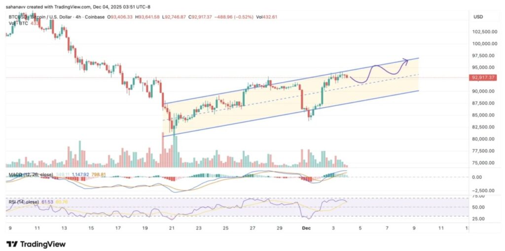 Pergerakan harga jangka pendek menunjukkan bahwa BTC tengah berada di jalur pemulihan, meskipun pergerakannya masih terjebak dalam pola kanal paralel naik (rising parallel channel). Karena harga terus menguji batas atas kanal tersebut, peluang terjadinya breakout cukup besar.
