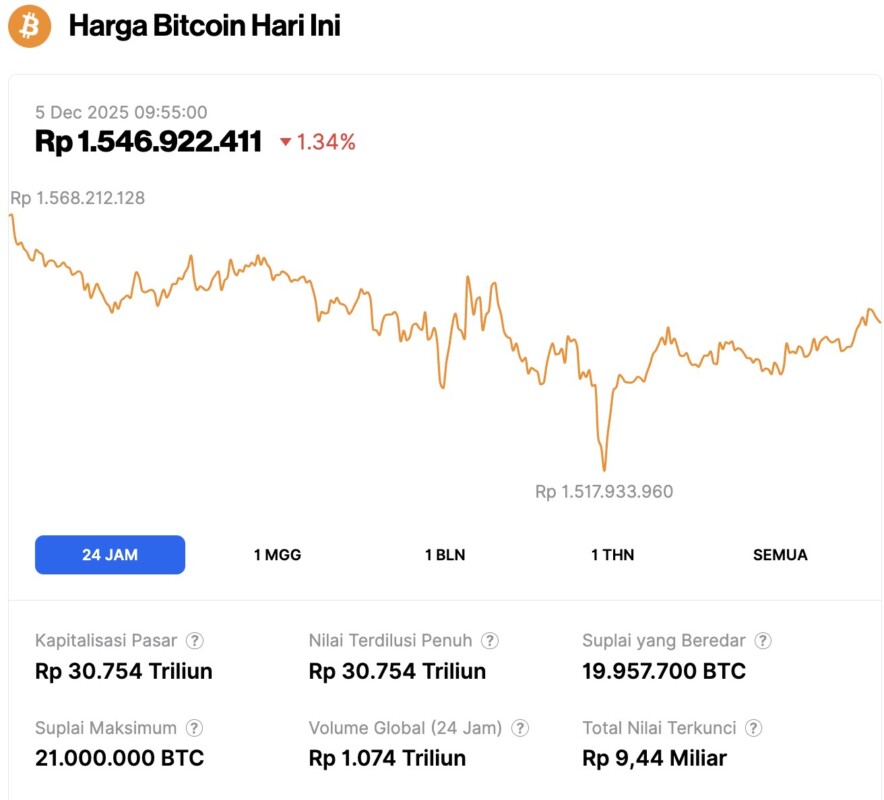 Pada 5 Desember 2025, harga Bitcoin tercatat berada di level $92,556 atau setara dengan Rp1.546.922.411, mengalami koreksi 1,34% dalam 24 jam terakhir. Sepanjang periode ini, BTC menyentuh level terendahnya di Rp1.517.933.960 dan harga tertingginya di Rp1.568.212.128.