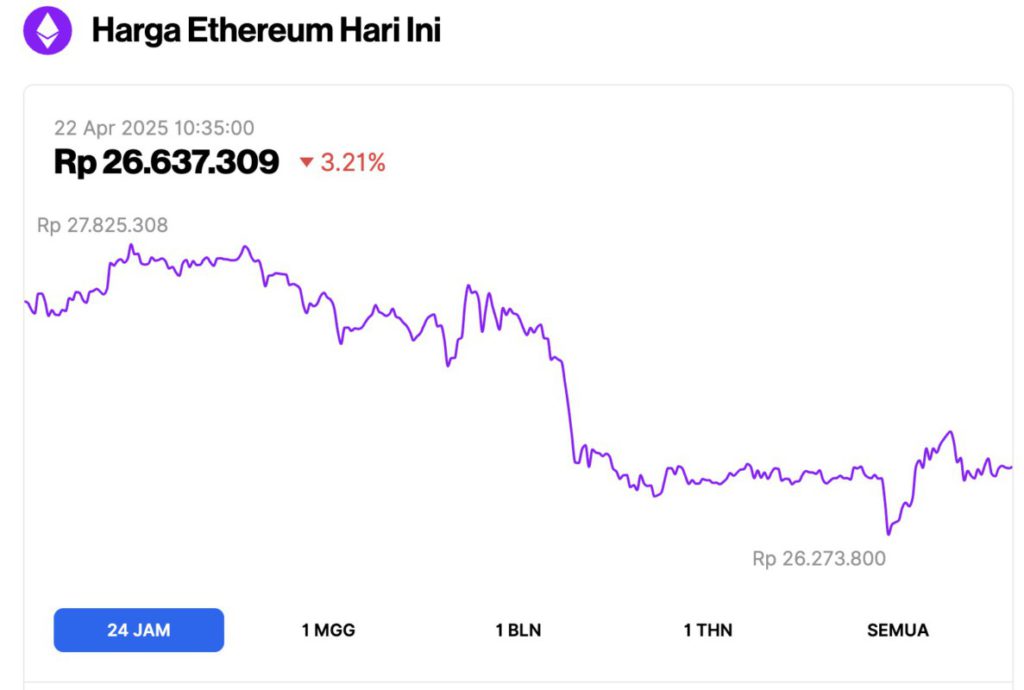 Per 22 April 2025, harga Ethereum (ETH) tercatat berada di sekitar $1,576 atau setara dengan Rp26.637.309, mengalami koreksi 3,21% dalam 24 jam terakhir. Sepanjang periode ini, ETH sempat menyentuh level tertingginya di Rp27.825.308, dan level terendahnya di Rp26.273.800.
