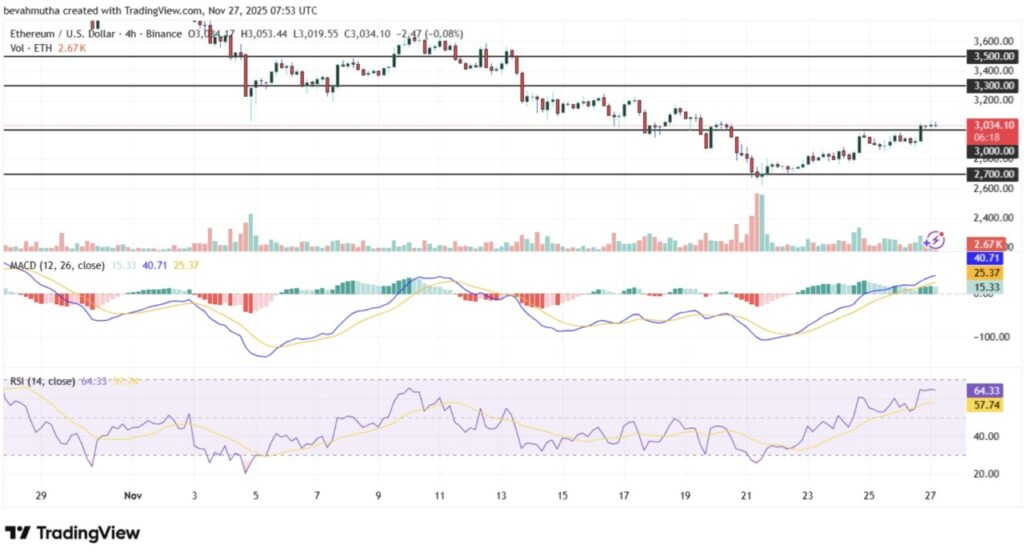 Harga Ethereum terus menguat setelah lonjakan signifikan pada 27 November. ETH saat ini bertahan di sekitar zona $3.030, menunjukkan kekuatan baru setelah periode konsolidasi mendatar selama beberapa hari.