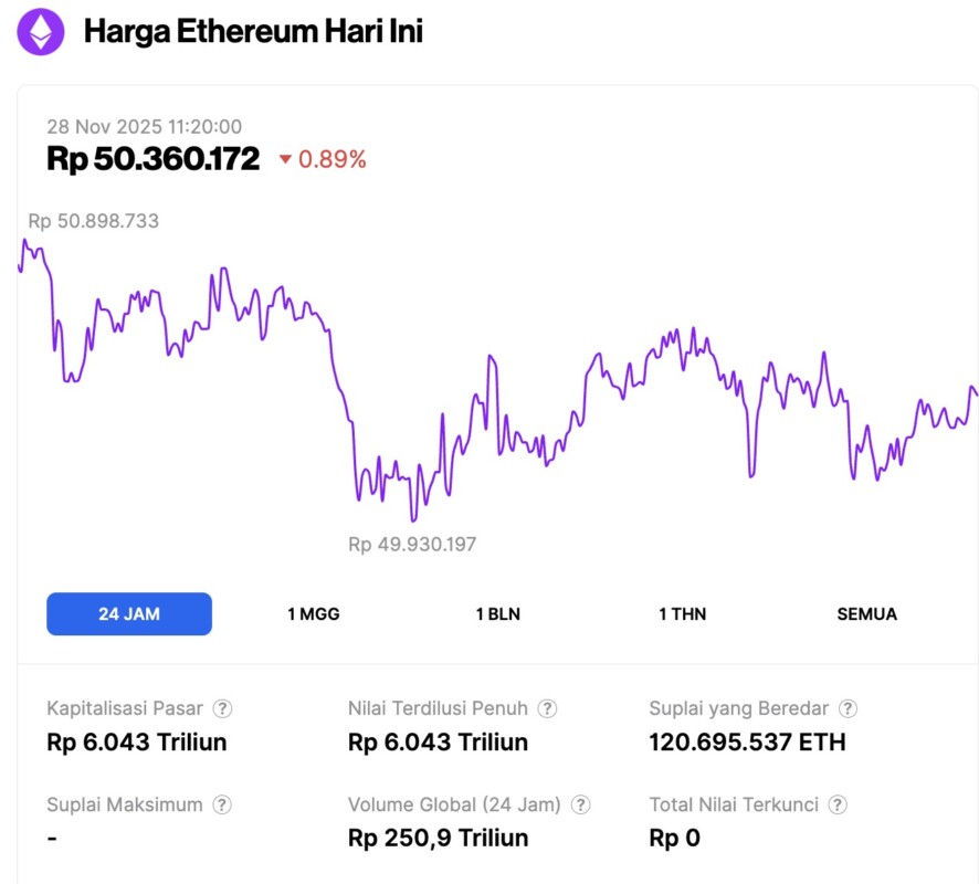 Pada 28 November 2025, harga Ethereum tercatat berada di sekitar $3,013 atau setara dengan Rp50.360.172, mengalami koreksi tipis 0,89% dalam 24 jam terakhir. Sepanjang periode ini, ETH sempat menyentuh level terendahnya di Rp49.930.197 dan level tertingginya di Rp50.898.733.
